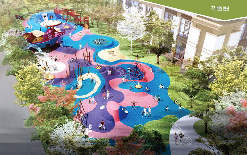 整個場地平面用五彩的橡膠地墊鋪設而成,俯瞰就像陽光照射下的波光粼粼的浪花一般奪人眼球,橡膠地墊為材料的高低起伏的地形既讓孩子充分感受攀山越嶺的快樂又能完好的保護孩子的安全。