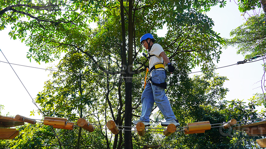 作為入門級(jí)線路,體驗(yàn)線高度適中,環(huán)節(jié)設(shè)置溫和有趣。包含短距離的獨(dú)木橋、蘑菇橋和交叉秋千橋等。它旨在幫助游客,尤其是孩子們,消除恐高心理,建立自信,初步掌握平衡與協(xié)調(diào)能力。