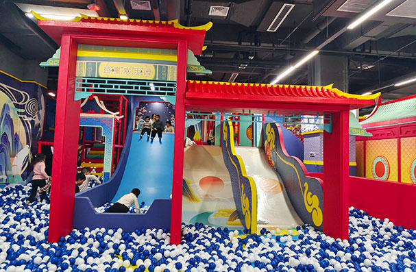 益童歡樂園國風兒童樂園,是奇樂集團上個月剛剛完成的大型兒童樂園項目,樂園以中國風中國紅為主要色調,加以古典的建筑造型,兒童樂園充滿了中國古代的風格,一進入場館,仿佛進入古代的場景,讓顧客感到驚喜。兩個墻壁上繪畫這中國古代過年的吉祥物,如鯉魚,仙鶴,祥云等圖案,十足的中國風兒童樂園。