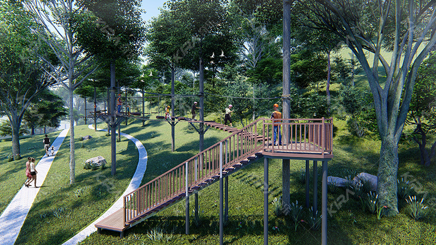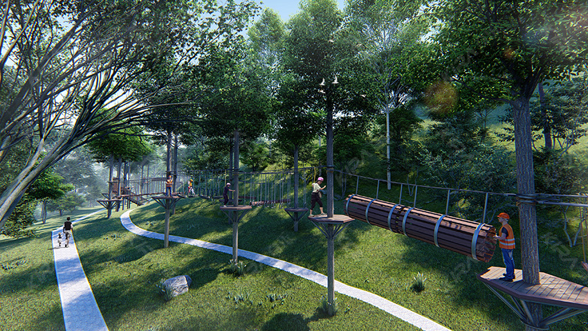本項目適用于各種親子主題類的樂園,巧妙運用“熊貓”IP造型設計,集拓展、探險、滑道、飛索、蹦極、不銹鋼滑梯、攀巖、爬網等46種不同運動體驗的文化主題項目,結合“大灰熊”IP形象,融入相關設計元素,打造差異化的網紅IP主題性運動拓展營地綜合體。 在裝飾設計上采用竹葉和竹竿的綠色設計元素,以原生態、自然風格為基調,采用原木、繩網和不銹鋼等柔韌度好的生態材料。滿足大眾貼近自然、主題鮮明、寓教于樂的兒童素質訓練教育親子樂園的精神訴求。